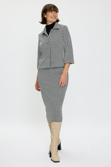 Indulge in timeless elegance with our Wales Pull On Skirt. This houndstooth kitten skirt is a versatile choice for both professional and casual set...